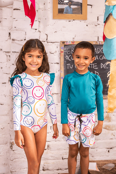One-piece swimsuit with long sleeves for sun protection with shoulder ruffles, printed with our ART MAKES YOU HAPPY design. The fabric has the highest ultraviolet protection factor, UPF50+ wich means the fabric creates a barrier against the sun´s UV rays. Made in Colombia
