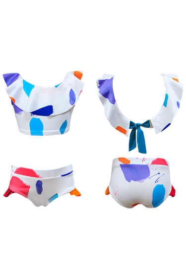 Two-piece bikini with our exclusive yellow PAINT print with an all-over ruffle on the neckline and back and a basic cut bottom, tie at the back. The fabric has the highest ultraviolet protection factor, UPF50+ wich means the fabric creates a barrier against the sun´s UV rays. Made in Colombia