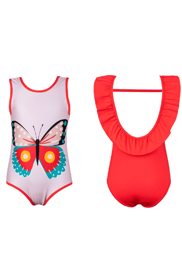 One piece swimsuit with lower scoop back with ruffle. Made of quick-drying UPF50+ fabric. Made in Colombia