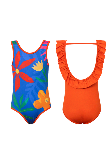 One piece swimsuit with lower scoop back with ruffle. Made of quick-drying UPF50+ fabric. Made in Colombia