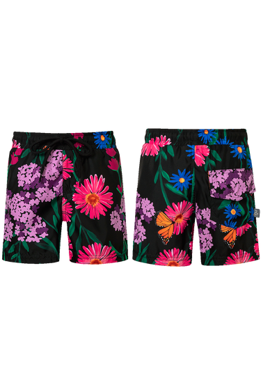 Boys swimshort with drawstring cord, elastic waistband, mesh liner and a back pocket. In our black flowers and butterflies print.