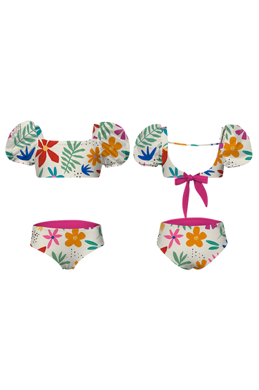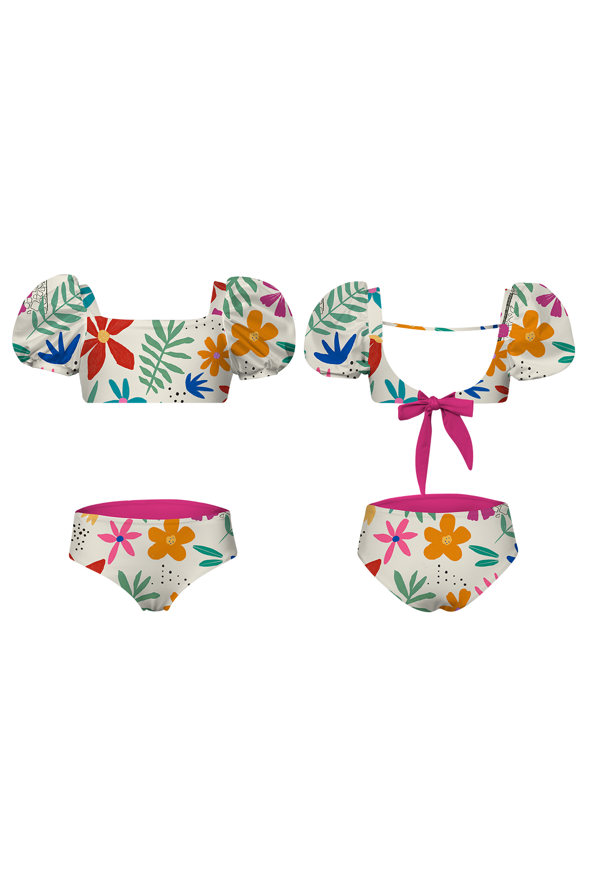 Two-piece bikini with short puff sleeve and a reversible bikini bottom. The fabric has UPF50+ protection factor which means that it acts as a protective shield against the sun’s UV rays. Made in Colombia
