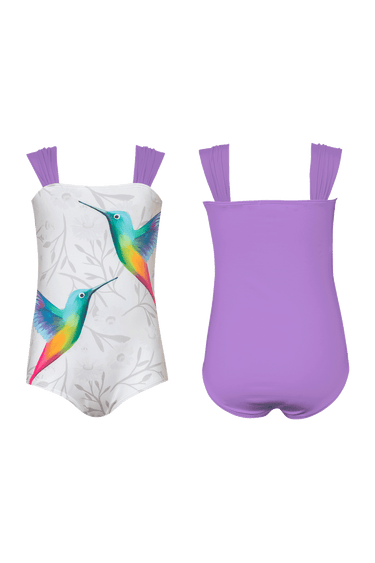 One piece swimsuit with two big colorfull hummingbirds print. Made of quick-drying UPF50+ fabric. Made in Colombia