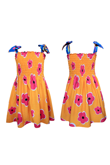 Short beach dress with smocked top in our yellow SPRAY FLOWERS print. Straps to tie with our CRAYOLA print. Made in Colombia