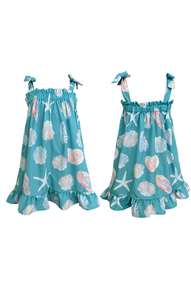Short wide beach dress with adjustable shoulder straps and elastic in chest contour and ruffles in skirt. Made in Colombia