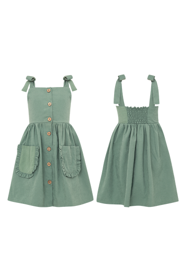 Girls’ dress made from extra lightweight and soft fabric, ideal for warm climates and summer days. Features two front skirt pockets decorated with ruffled trim, front buttons, and adjustable tie straps for a comfortable, customized fit. Its fresh and versatile design allows freedom of movement, making it perfect for everyday wear, outings, the beach, vacations, or special events.