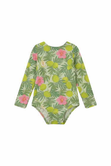 Baby one-piece long-sleeve swimsuit designed for comfort and sun protection. Features a allover print and UPF 50+ sun-protective fabric to help protect delicate skin. Designed with snap closures at the bottom to allow for easy diaper changes. Made for a secure fit and comfortable wear in and out of the water. Made in Colombia