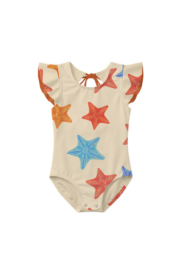 One-piece swimsuit with eye catching flounce sleeves! Open back with a ribbon bow. Made of quick-drying UPF50+ fabric. Designed with snap closures at the bottom to allow for easy diaper changes.  Made in Colombia