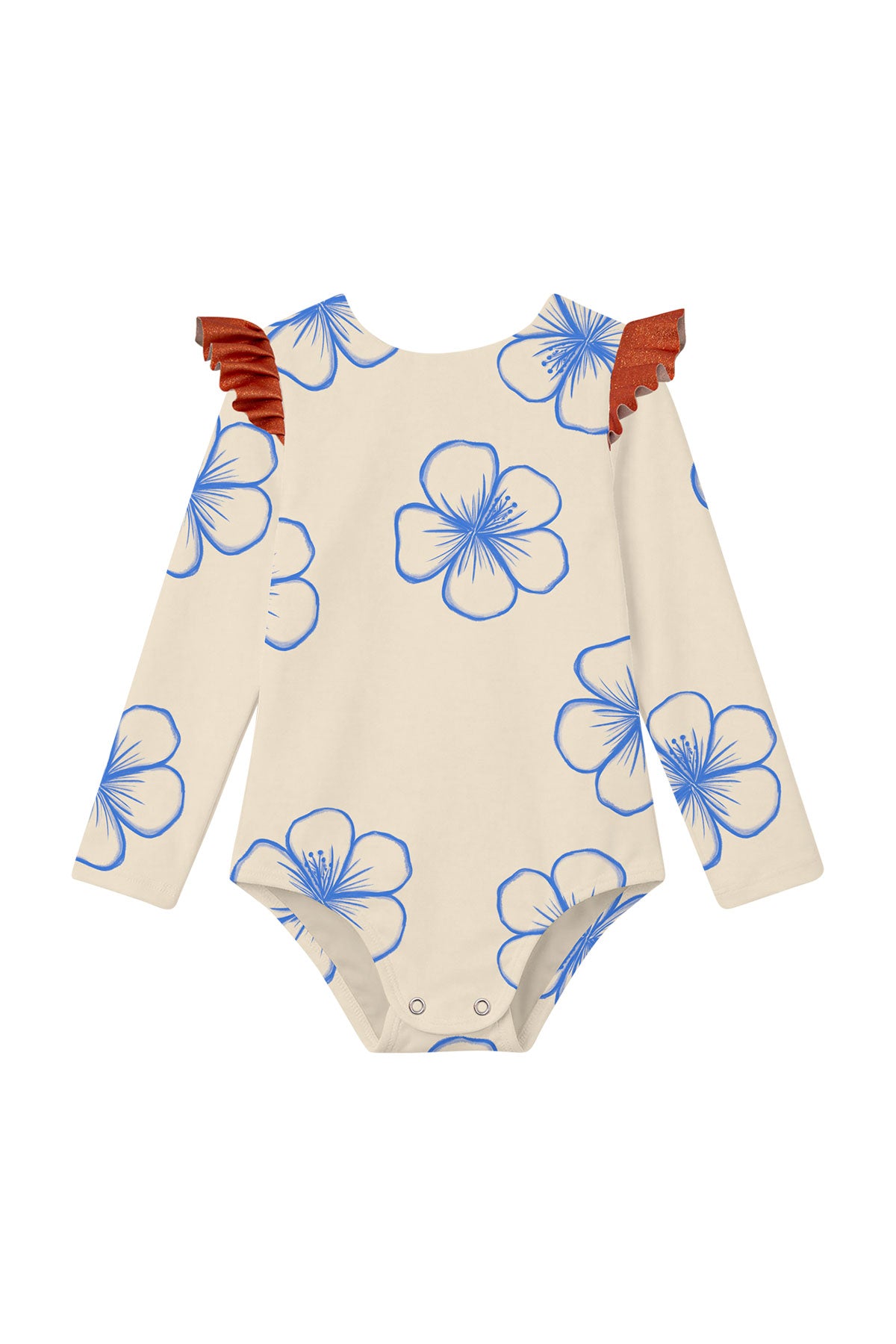 Baby one-piece long-sleeve swimsuit designed for comfort and sun protection. Features a allover print and UPF 50+ sun-protective fabric to help protect delicate skin. Designed with snap closures at the bottom to allow for easy diaper changes. Made for a secure fit and comfortable wear in and out of the water.