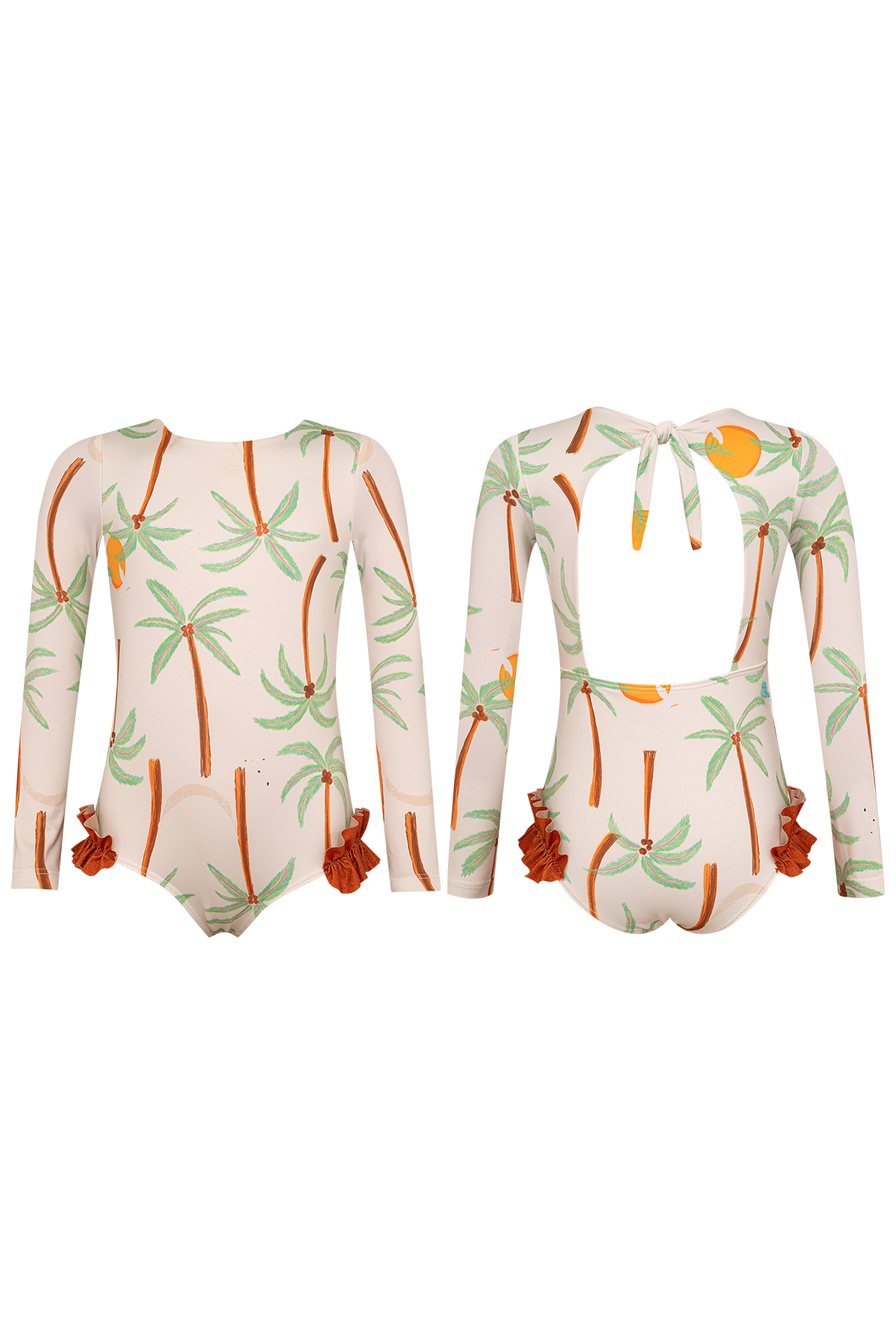 Long sleeve one-piece swimsuit for sun protection, back tie and ruffles on the legs. The fabric has the highest ultraviolet protection factor, UPF50+ wich means the fabric creates a barrier against the sun´s UV rays. Made in Colombia