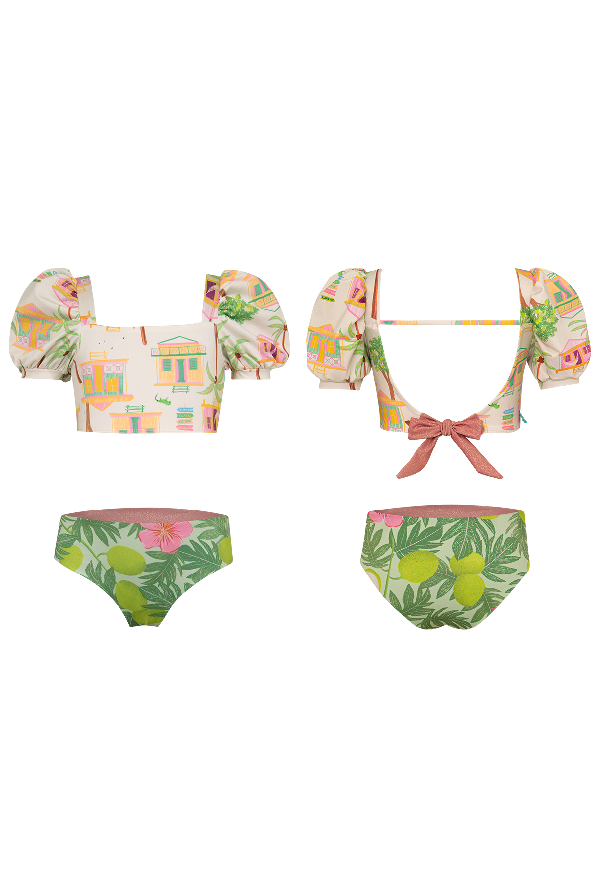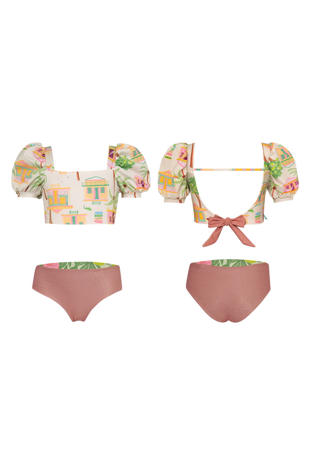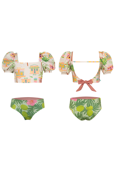 Two-piece bikini with short puff sleeve and a reversible bikini bottom. The fabric has UPF50+ protection factor which means that it acts as a protective shield against the sun’s UV rays. Made in Colombia