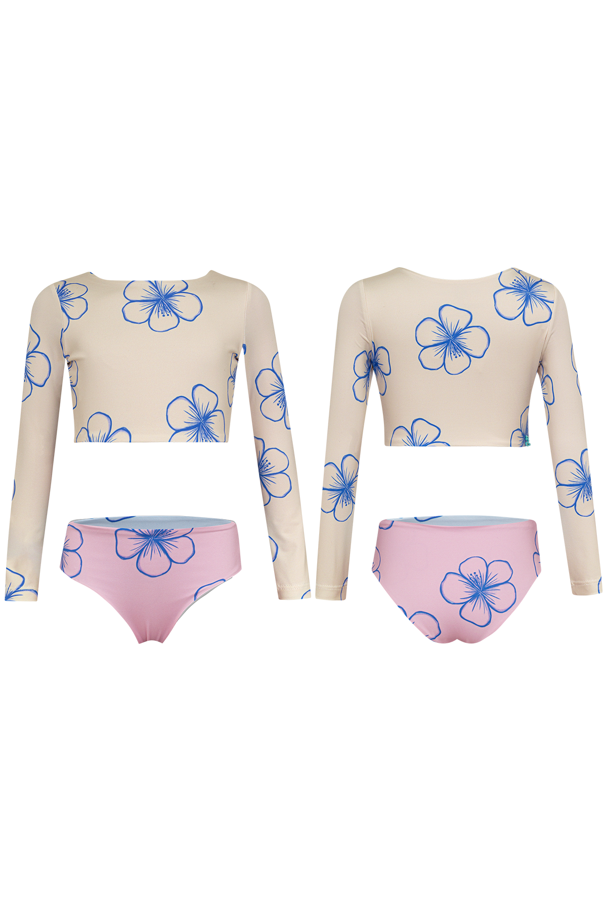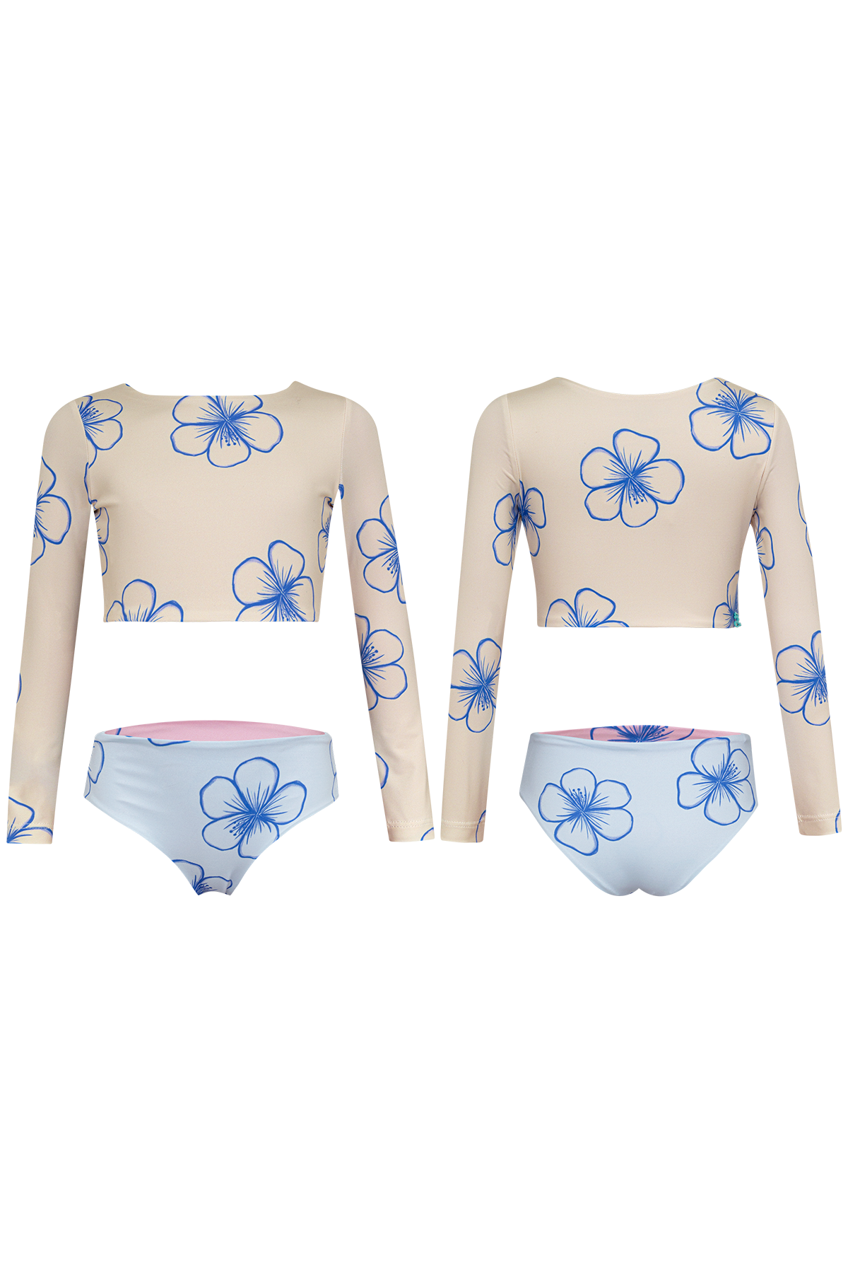 Bikini with longsleeve top and reversible bottoms. The fabric has UPF50+ protection factor which means that it acts as a protective shield against the sun's UV rays. Made in Colombia