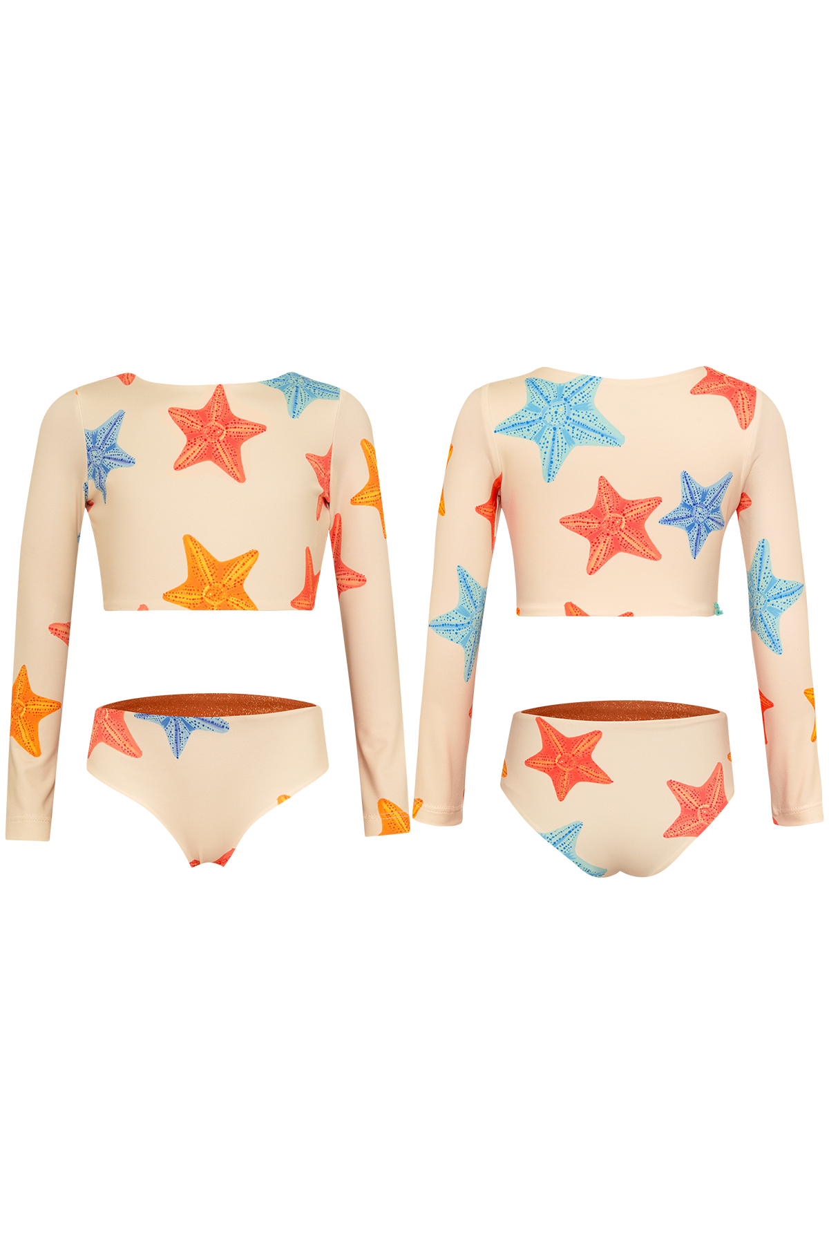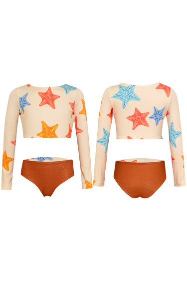 Bikini with longsleeve top and reversible bottoms. The fabric has UPF50+ protection factor which means that it acts as a protective shield against the sun's UV rays. Made in Colombia