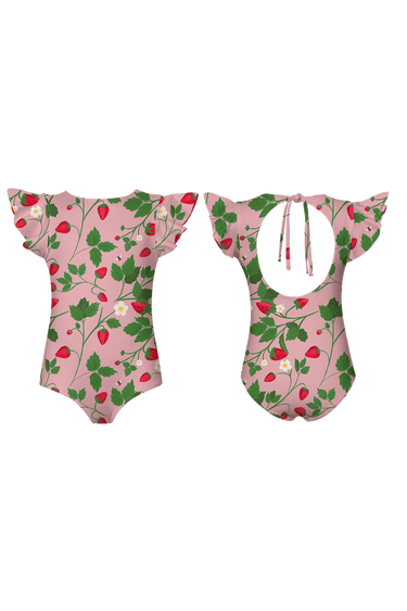 One-piece swimsuit with eye catching flounce sleeves! Open back with a ribbon bow. Made of quick-drying UPF50+ fabric. Made in Colombia