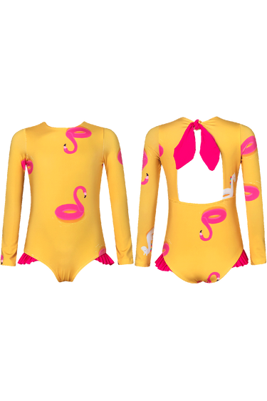 Long sleeve one-piece swimsuit for sun protection, back tie and fucsia ruffles.. The fabric has the highest ultraviolet protection factor, UPF50+ wich means the fabric creates a barrier against the sun´s UV rays. Made in Colombia