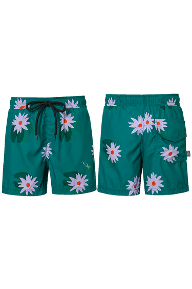 Boys Swimshort with drawstring cord, elastic waistband, mesh liner and a back pocket. In our green LOTO print.