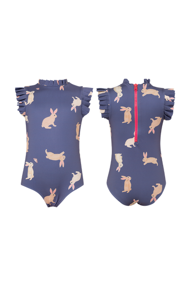 Meet the sweetest swimsuit for your little one's adventures! This charming one-piece features an adorable bunny print, complete with delicate ruffles on the sleeves and neck. Designed for both style and comfort, its classic fit and easy back zipper make it perfect for a day of play.