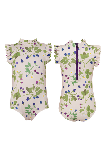 This charming one-piece swimsuit is picked for play and comfort. Featuring a whimsical berry and leaf print, it comes complete with delicate ruffles on the sleeves and neck. Designed with an easy back zipper, it's the perfect mix of sweet style and practicality for a day at the beach or pool.