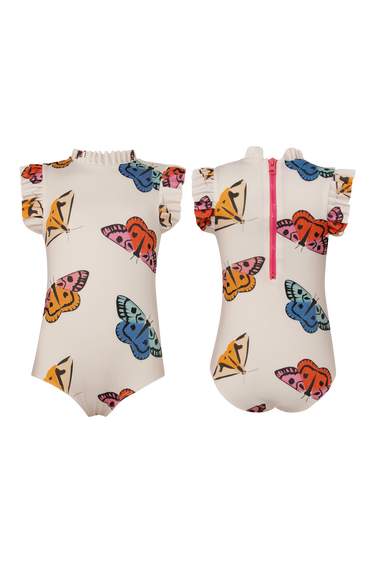 Get ready to make a splash with our charming butterfly swimsuit! This adorable one-piece features a vibrant butterfly print, complete with sweet ruffle details on the sleeves and neck. Designed with a convenient back zipper, it's a perfect blend of playful style and easy-to-wear comfort.