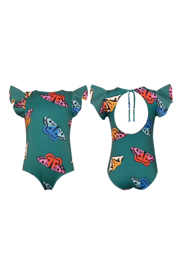 One-piece swimsuit with eye catching flounce sleeves! Open back with a ribbon bow. Made of quick-drying UPF50+ fabric. Made in Colombia
