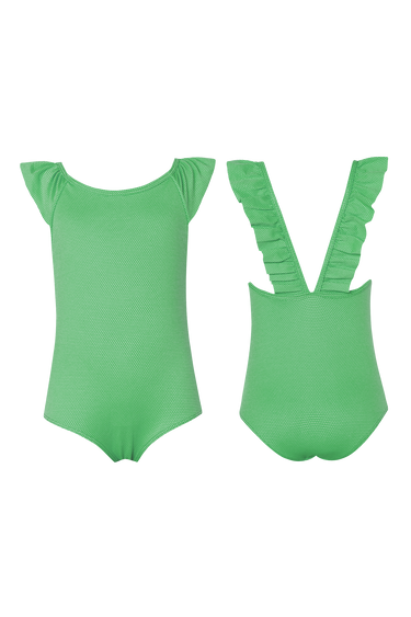 One-piece short sleeve swimsuit with round neckline and deep back neckline with ruffles. The fabric has UPF50+ protection factor which means that it acts as a protective shield against the sun's UV rays. Made in Colombia
