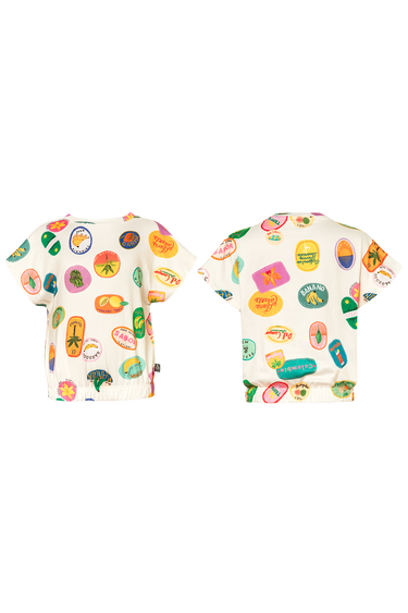A fun and colorful T-shirt inspired by iconic fruit stickers. Has a comfy fit and short sleeves for extra freshness. The elastic hem adds a special touch, making it perfect to pair with jeans, shorts, or skirts. Ideal for adding a tropical and cheerful vibe to any outfit!