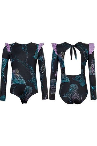One-piece swimsuit with long sleeves for sun protection with shoulder ruffles. The fabric has the highest ultraviolet protection factor, UPF50+ wich means the fabric creates a barrier against the sun´s UV rays. Made in Colombia