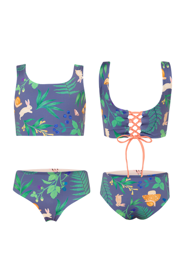 On one side, you'll find a whimsical forest print with bunnies and snails, while the other side features a delicate moth pattern. The top includes a playful lace-up detail in the back for a perfect fit. It's the ultimate set for mixing, matching, and making a splash!