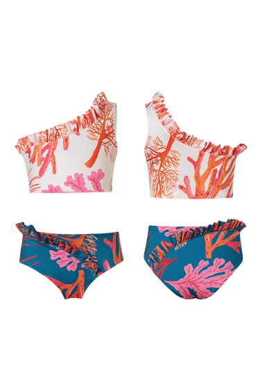 Bikini top with asymmetrical neckline with contour ruffles and bikini bottoms with asymmetrical front and back ruffles. The fabric has UPF50+ protection factor which means that it acts as a protective shield against the sun's UV rays. Made in Colombia