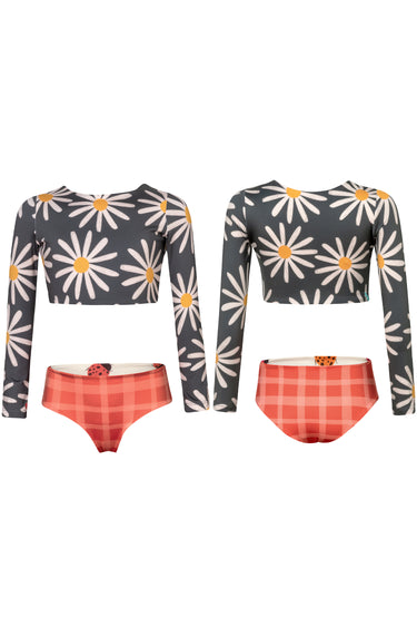 Bikini with longsleeve top and reversible bottoms. Made with recycled fabric with UPF50+ protection factor which means that it acts as a protective shield against the sun's UV rays. Made in Colombia
