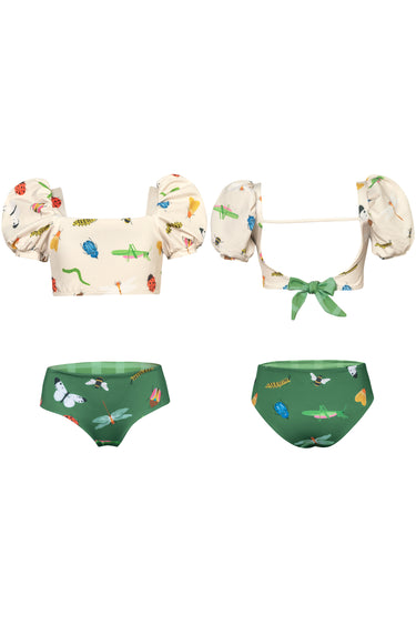 Two-piece bikini with short puff sleeve with a reversible bikini bottom. The fabric has UPF50+ protection factor which means that it acts as a protective shield against the sun’s UV rays. Made in Colombia