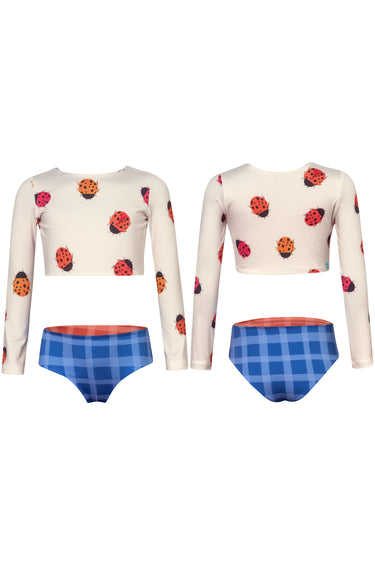 Bikini with longsleeve top and reversible bottoms. Made with recycled fabric with UPF50+ protection factor which means that it acts as a protective shield against the sun's UV rays. Made in Colombia
