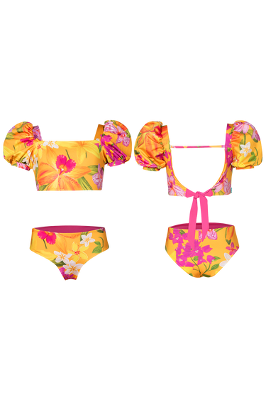 Two-piece bikini with short puff sleeve and a reversible bikini bottom. The fabric has UPF50+ protection factor which means that it acts as a protective shield against the sun’s UV rays. Made in Colombia