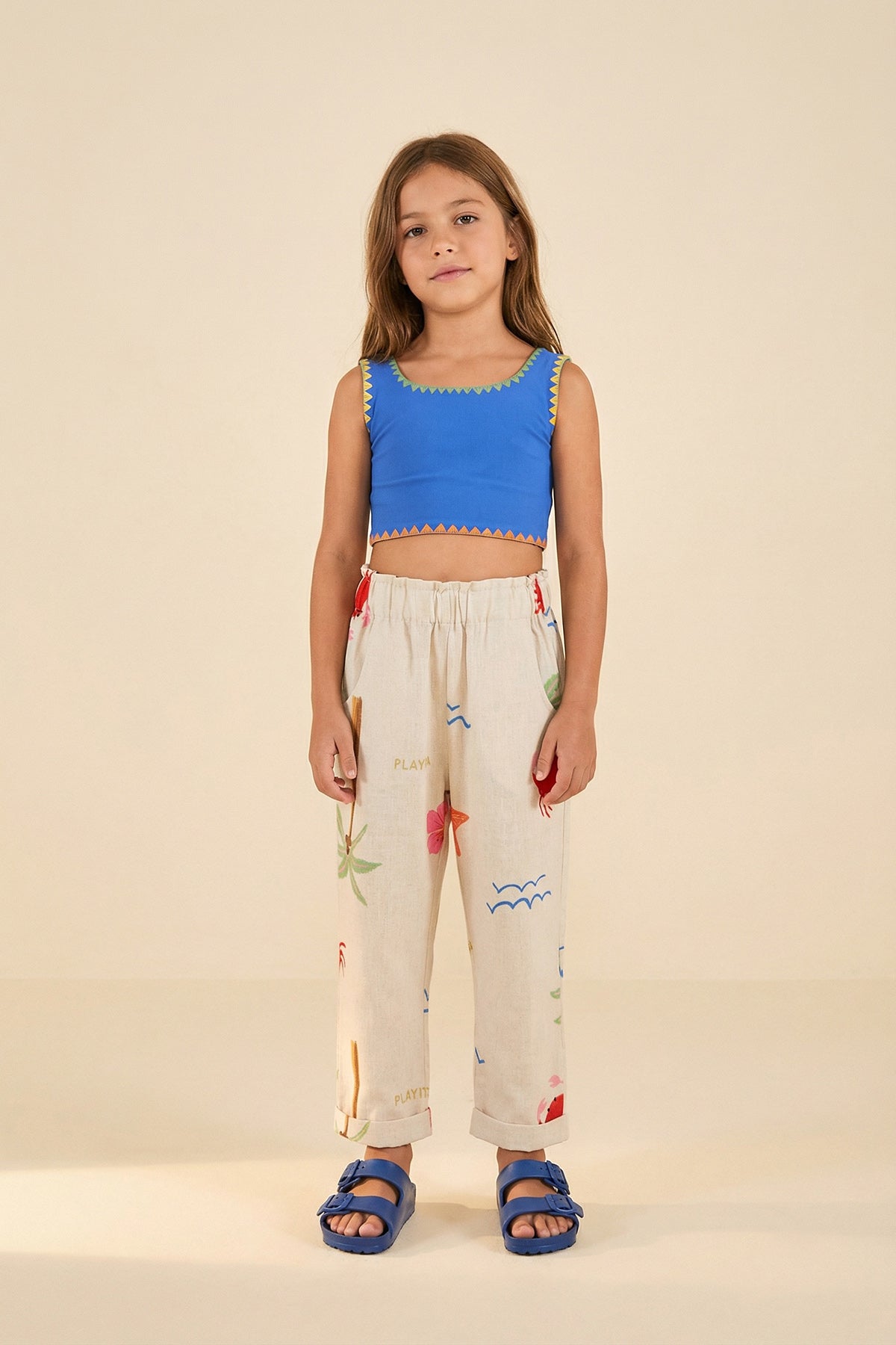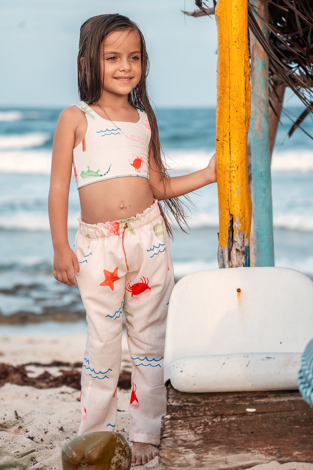 Wide-leg kids’ pants made from ultra-soft and lightweight fabric, designed to ensure freedom of movement and all-day comfort. Featuring two back pockets with grommet detailing and an elastic waistband that fits perfectly without pinching. A versatile design that pairs easily with t-shirts, sweaters, or even better — with our bikinis and swimwear! Perfect for everyday wear, school, travel, or outdoor activities.Made in Colombia with high-quality materials. Ideal as casual wear, comfortable kids’ fashion, or a practical gift for boys and girls.