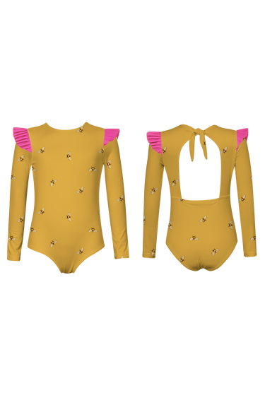 One-piece swimsuit with long sleeves for sun protection with shoulder ruffles. The fabric has the highest ultraviolet protection factor, UPF50+ wich means the fabric creates a barrier against the sun´s UV rays. Made in Colombia .Please note that this item is not eligible for exchanges or returns.