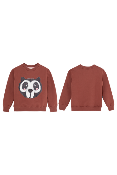 Brushed cotton kids’ sweatshirt in terracotta, soft, warm, and perfect for cold days. Features a fun front print of our spectacled bear, adding a sweet and original touch to children’s outfits. Includes ribbed neckline, cuffs, and hem for better fit, comfort, and durability. Ideal as a sweatshirt for boys or girls, perfect for everyday wear, school, outings, or outdoor activities. Easy to pair with jeans, leggings, or joggers. High-quality garment, wash-resistant, and designed to accompany little ones on all their adventures.