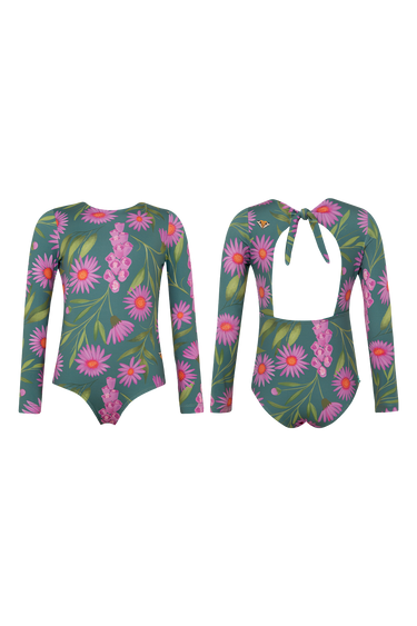 One-piece swimsuit with long sleeves for sun protection, the fabric has the highest ultraviolet protection factor, UPF50+ wich means the fabric creates a barrier against the sun´s UV rays. Made in Colombia