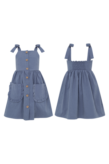Girls’ dress made from extra lightweight and soft fabric, ideal for warm climates and summer days. Features two front skirt pockets decorated with ruffled trim, front buttons, and adjustable tie straps for a comfortable, customized fit. Its fresh and versatile design allows freedom of movement, making it perfect for everyday wear, outings, the beach, vacations, or special events.