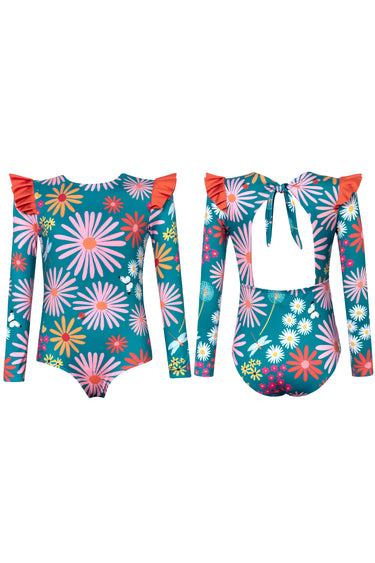 One-piece swimsuit with long sleeves for sun protection with shoulder ruffles. Made with recycled fabric with UPF50+ wich means the fabric creates a barrier against the sun´s UV rays. Made in Colombia
