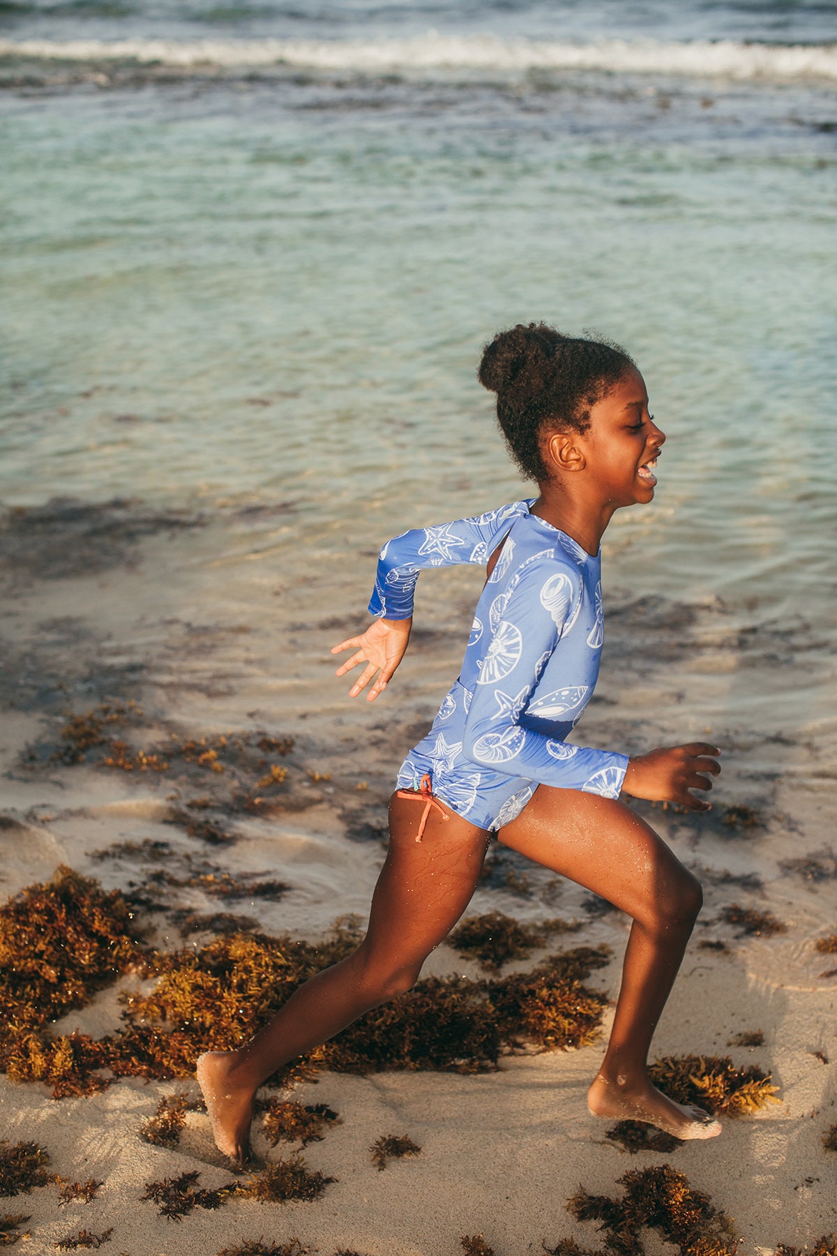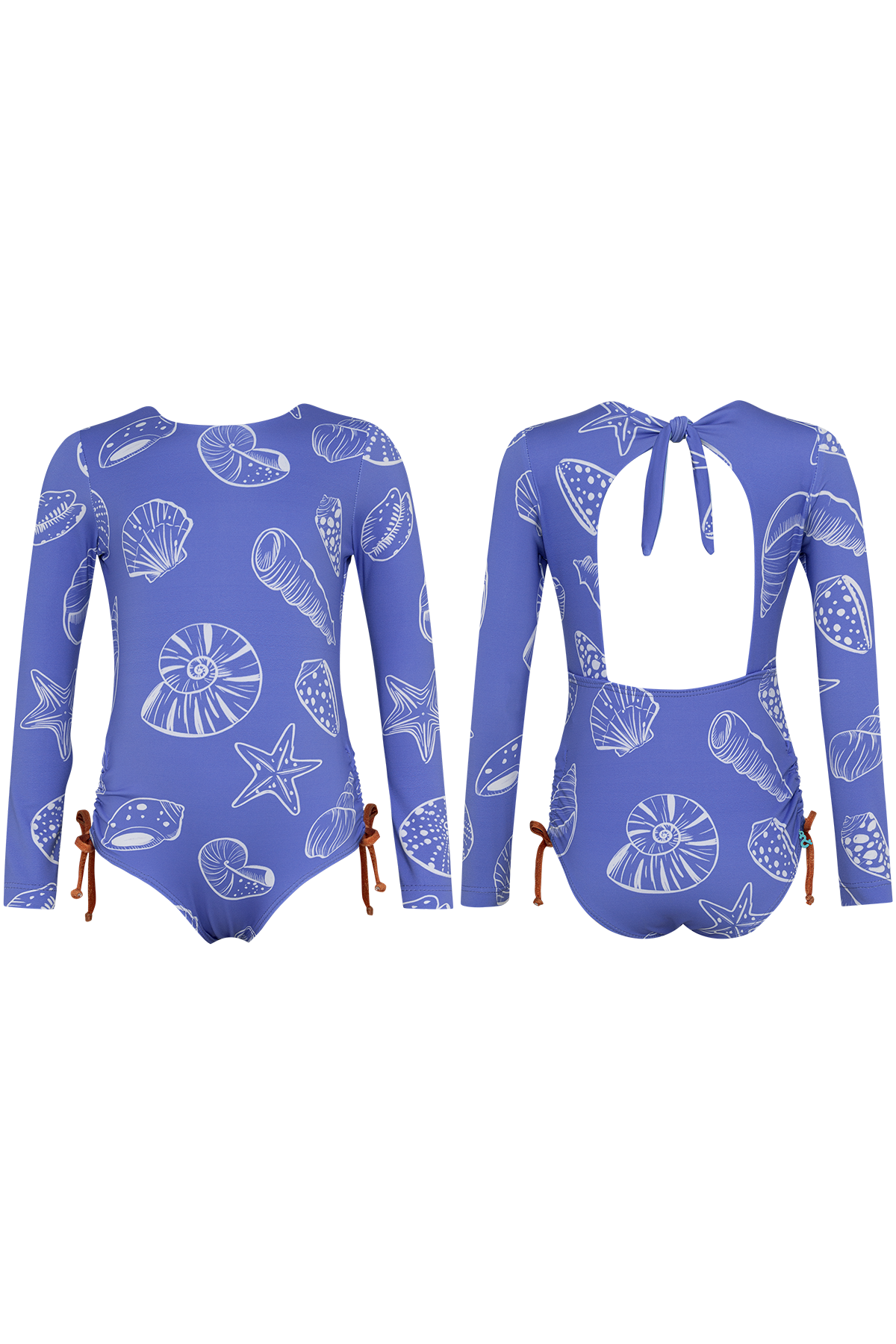 One-piece swimsuit with long sleeves for sun protection with side gathers. The fabric has the highest ultraviolet protection factor, UPF50+ wich means the fabric creates a barrier against the sun´s UV rays. Made in Colombia