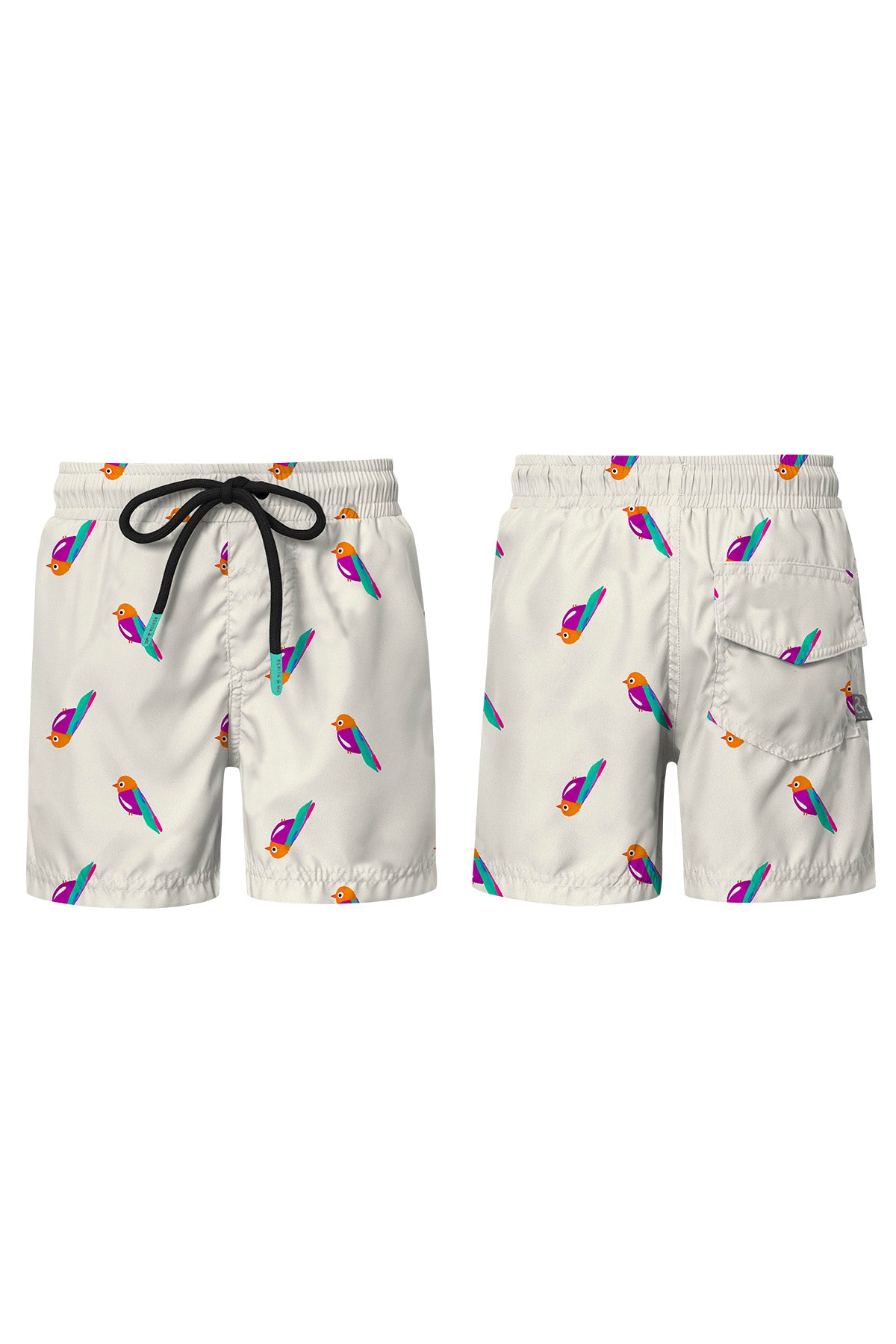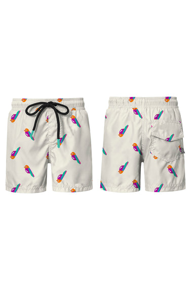 Boys swimshorts with drawstring, elastic waist, inner lining with no holes (not mesh) and back pocket. Made in Colombia