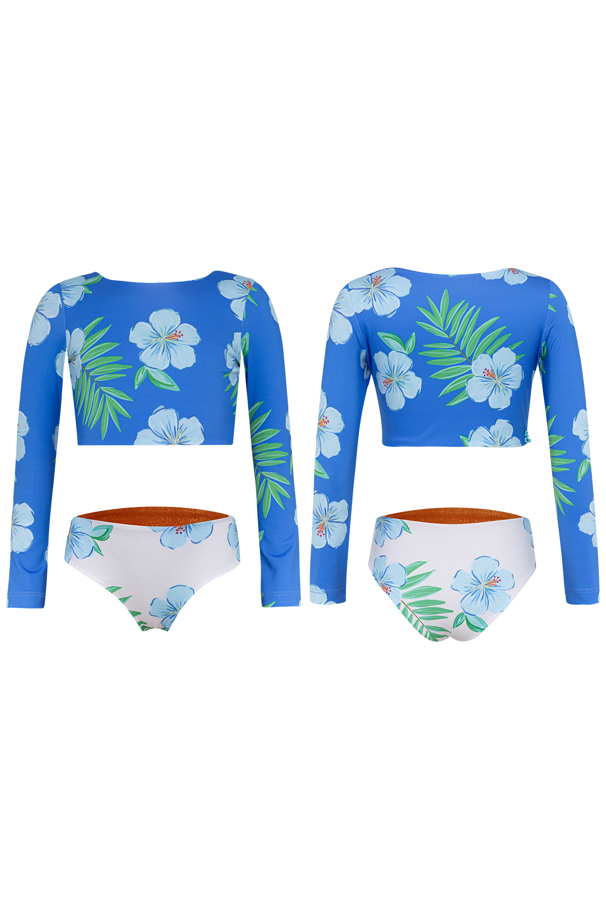 Bikini with longsleeve top and reversible bottoms. The fabric has UPF50+ protection factor which means that it acts as a protective shield against the sun's UV rays. Made in Colombia